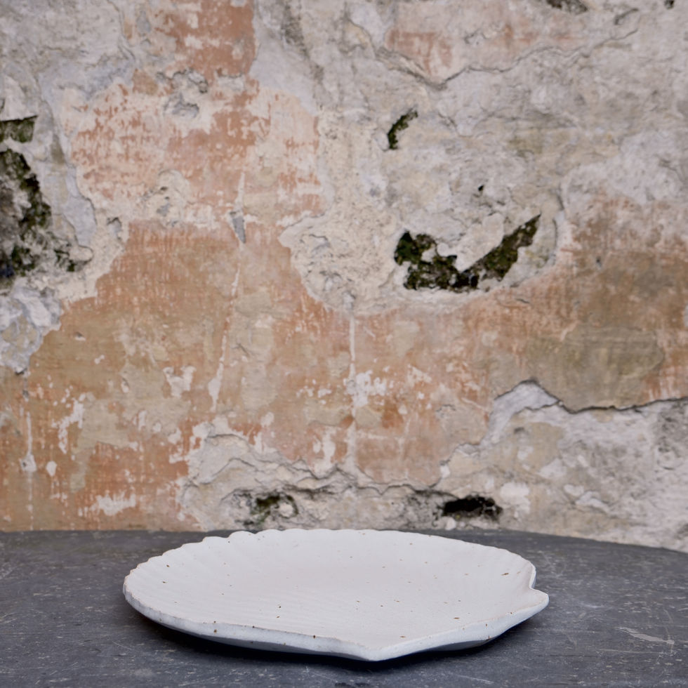 Stoneware shell plate (large or medium) in matt white glaze with speckles.