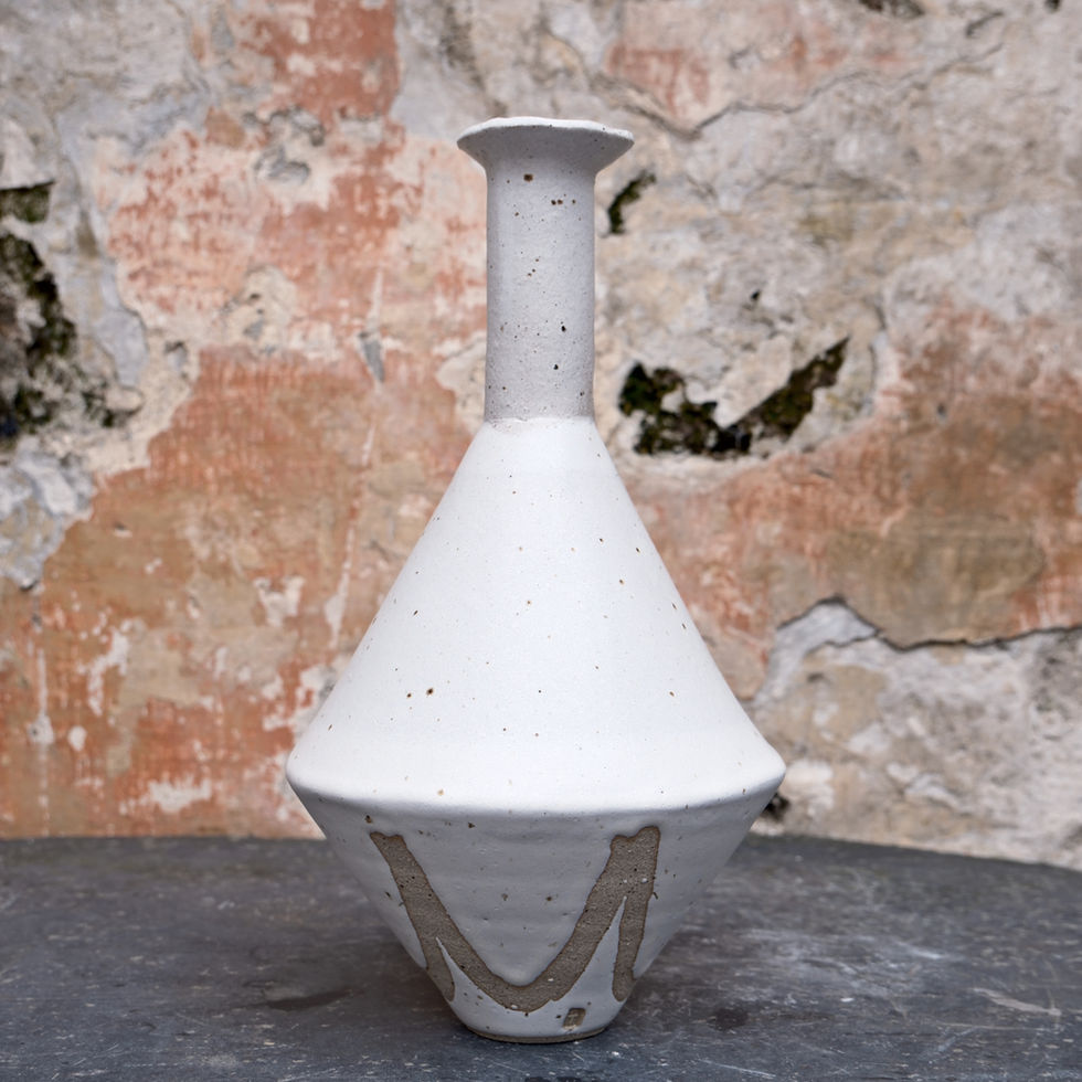 This vase is handmade in Abergwaun, Wales, using locally sourced stoneware clay, blended with grog to create a unique speckled finish on every piece. Each vase is made through a combination of wheel-throwing and handbuilding, embracing slight variances and a bit of wonkiness—an intentional touch of controlled messiness that highlights its handcrafted nature.